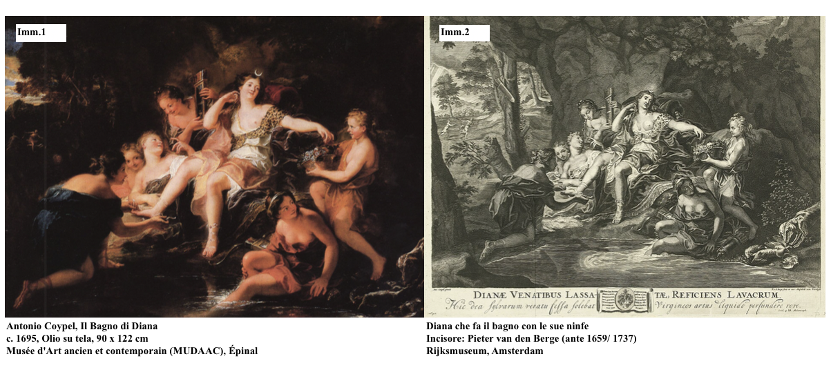 L'opera deriva, seppur variando in alcuni aspetti, da una composizione di Antoine Coypel (Parigi 1661 - 1722) custodita nel Musée Départemental des Vosges a Épinal, in Francia (imm.1 - https://www.pubhist.com/w74885 ), celebrata già ai tempi grazie ad incisori come Pieter van den Berge (1694 - 1737) che contribuirono alla sua diffusione (Rijksmuseum, Amsterdam, imm.2 - https://id.rijksmuseum.nl/200395096 ).
