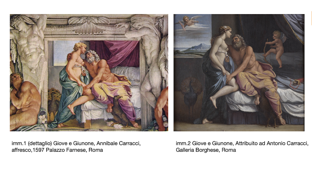 Tra le numerose copie posteriori, possiamo menzionare il dipinto, realizzato su tela, ed attribuito ad Antonio Carracci, oggi custodito nella Galleria Borghese a Roma (imm.2 - https://www.collezionegalleriaborghese.it/opere/giove-e-giunone).